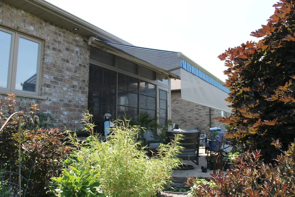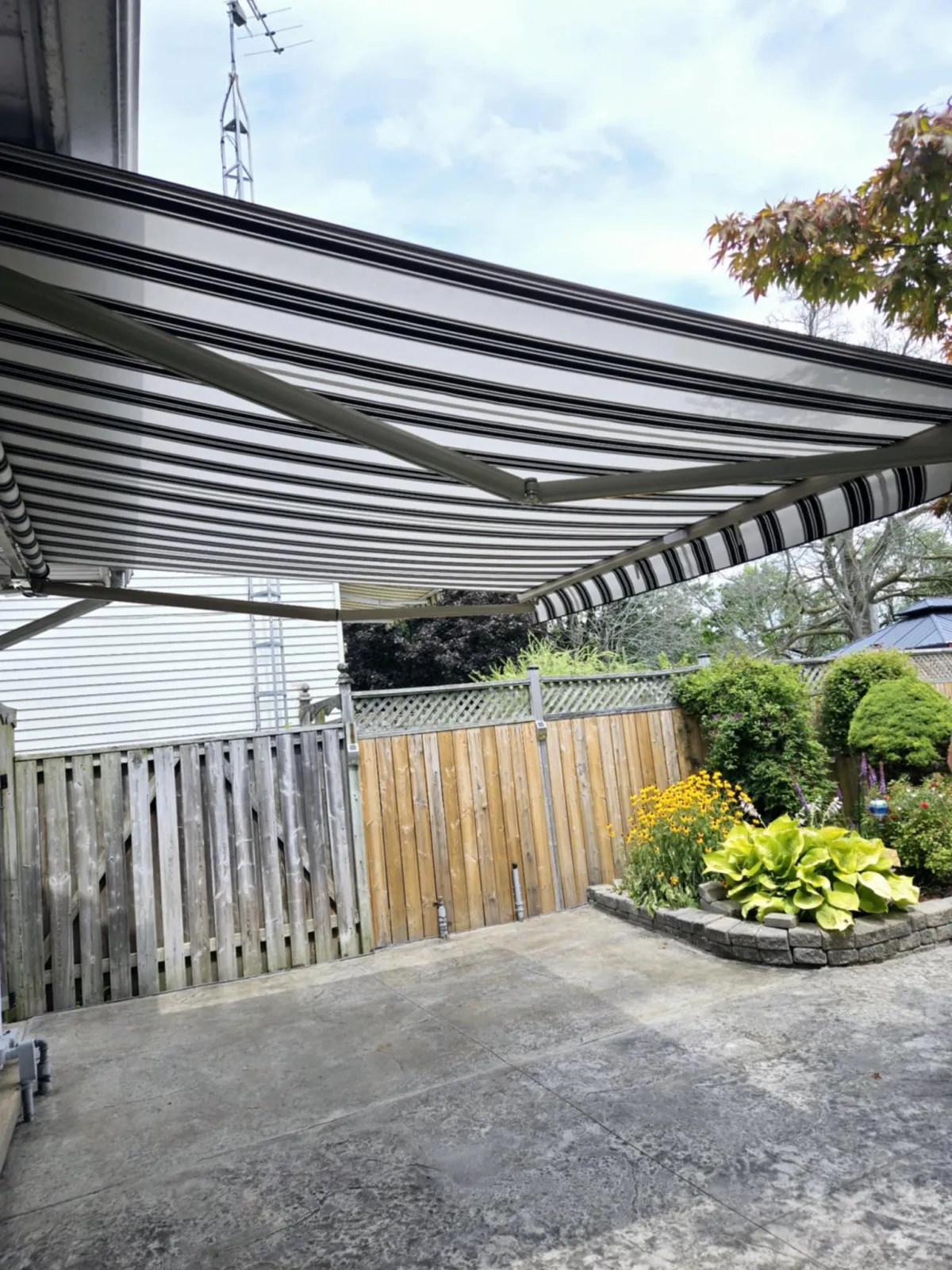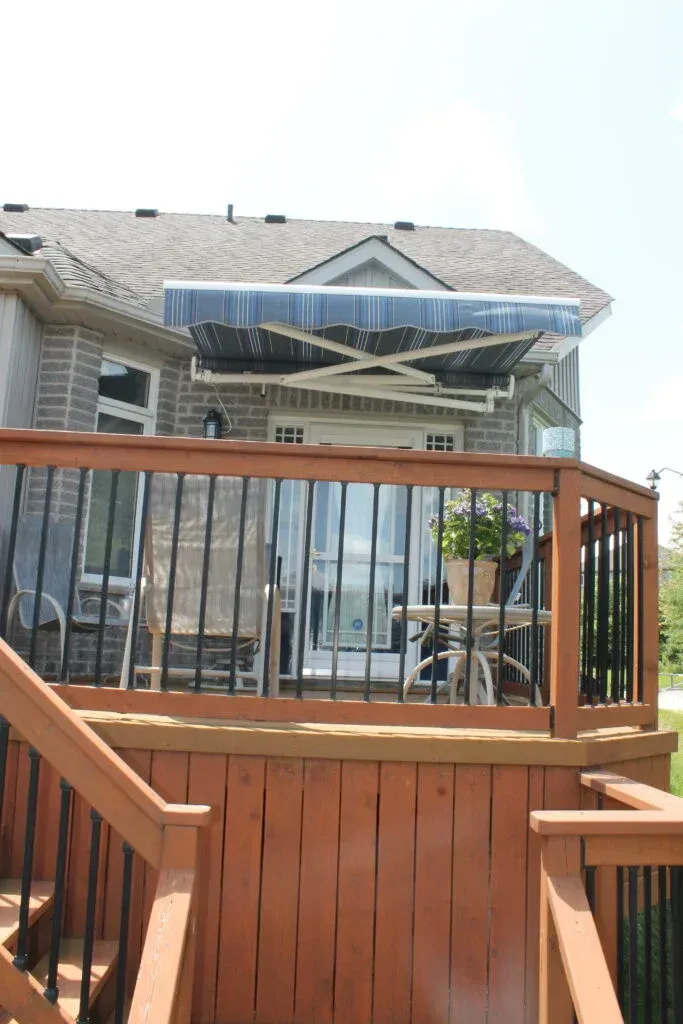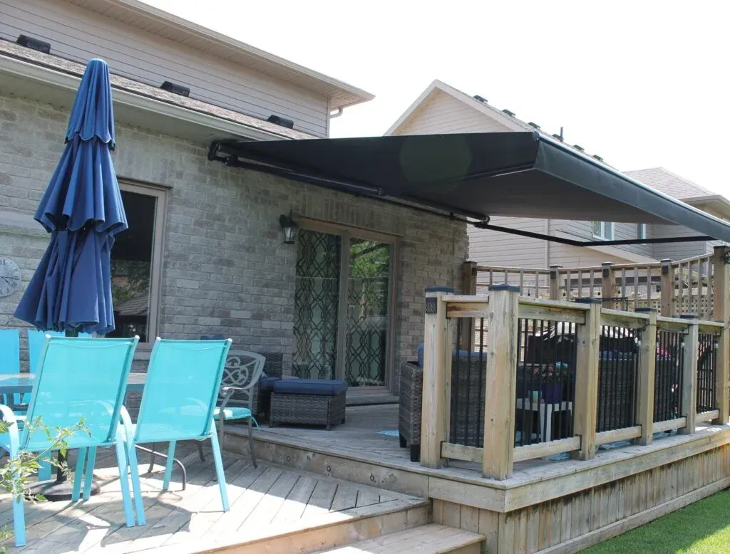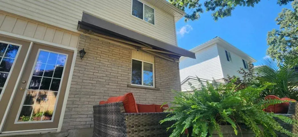 The fabric that we use on our awnings, unless otherwise specified, is a solution-dyed acrylic material. Unlike cottons or canvas, this acrylic is resistant to rot, mould, and mildew. This tightly woven fabric is 98-99% UV and water-resistant.